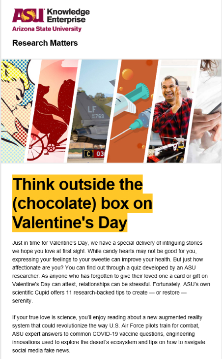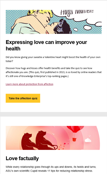 Just in time for Valentine’s Day, we have a special delivery of intriguing stories we hope you love at first sight. While candy hearts may not be good for you, expressing your feelings to your sweetie can improve your health. But just how affectionate are you? You can find out through a quiz developed by an ASU researcher. As anyone who has forgotten to give their loved one a card or gift on Valentine’s Day can attest, relationships can be stressful. Fortunately, ASU’s own scientific Cupid offers 11 research-backed tips to create — or restore — serenity.